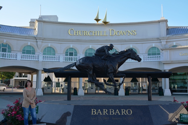 Happy 4th of July! Lindsay and I decided to wake up early and get over to Churchill Downs Museum for the opening at 8am. The kids wanted no part of waking up early so we locked the door and left them asleep. We arrived and got set up for the 8:30 tour. That gave us some time to view the museum before heading out to the track. Lots of neat memorabilia from the 140+ years of Kentucky Derby’s that have been run. Our tour guide was great and he shared lots of info with us as we took the 40 minute tour. We learned about Triple Crown winners of years gone by, trainers, old cheating tricks and much more. The highlight was definitely walking out to the track’s edge under the famous twin spires!