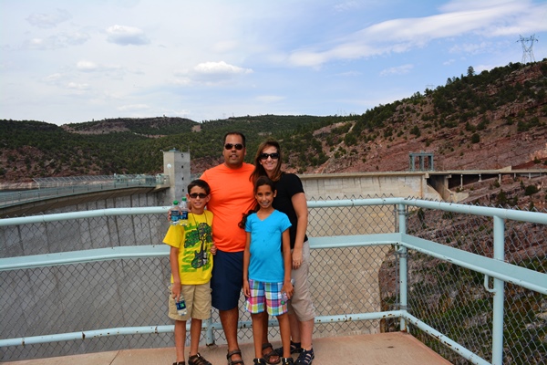 Dam visitor center. They had a free 1 hour tour at 3pm and we were the only ones on it! I told the kids I paid extra for the private tour! Wow is all I can say about the dam tour. That dam tour was the best I have ever been on- the first, but also the best! They take you on a walkway over the dam where you can see 502′ to the river below. A quick ride in the elevator to the bottom and you can see up to the top. We did a brief tour of the generating room and then went outside. We fed the fish at the bottom (different varieties of trout). Very glad we made the time to take that dam tour. We left the dam and continued on towards Mustang Ridge/Sunny Cove so everyone could get there feet in the cold water. There were no shortage of crazy Utahians who were swimming in the mid 60 degree water. Too cold for me, but V was sore that we did not let her get fully in. We drove back across the dam and went to the Red Canyon Visitor Center area. We had a nice dinner at the Red Canyon Lodge restaurant and then traveled down to the visitor center. It had closed but the cliffs and views were still wide open for viewing. Beautiful views across the 3000’+ wide canyon that is over 1600′ deep! L (hereby named Nervous Nellie) was terrified that the kids were going to climb over the fence and plunge to the canyon